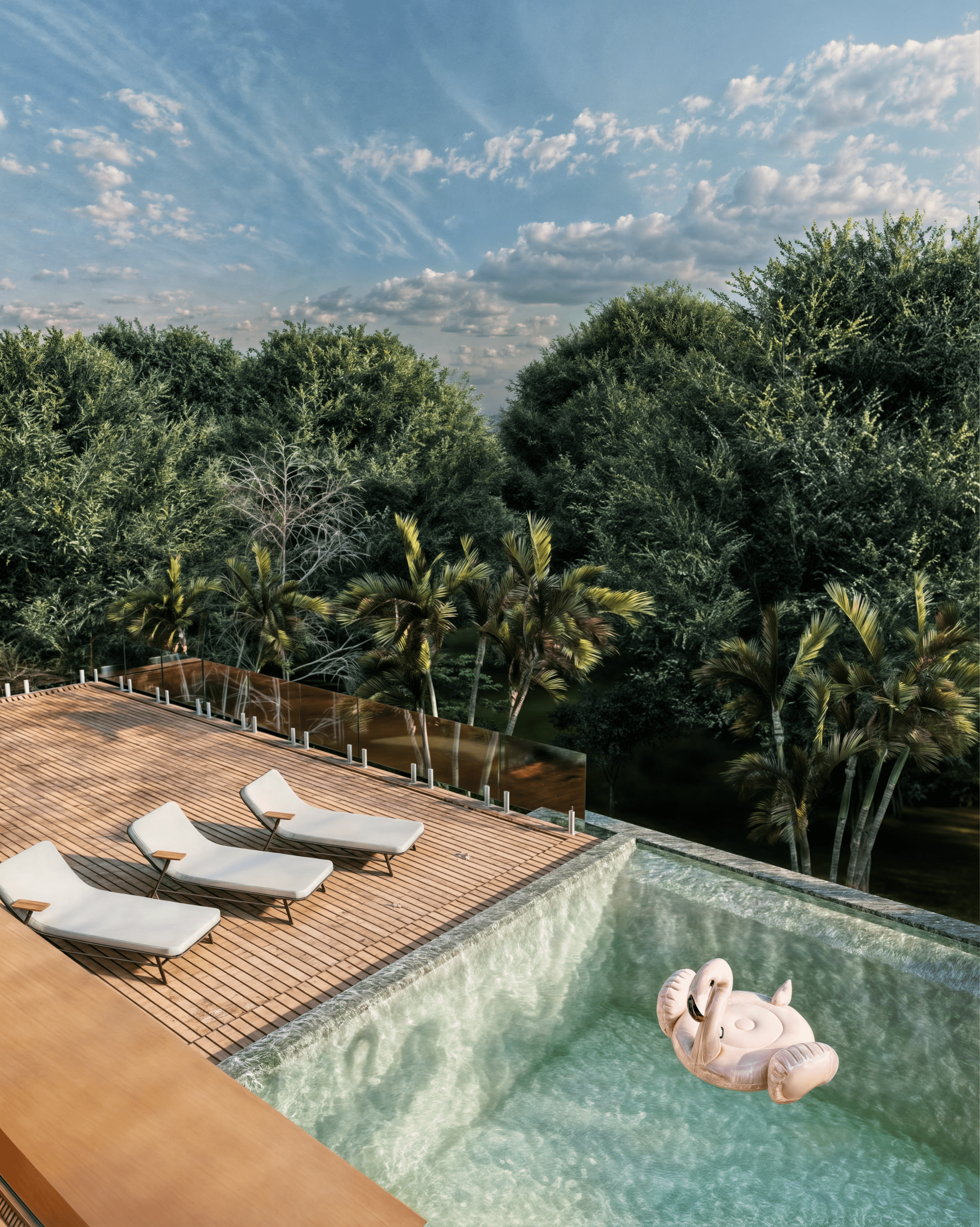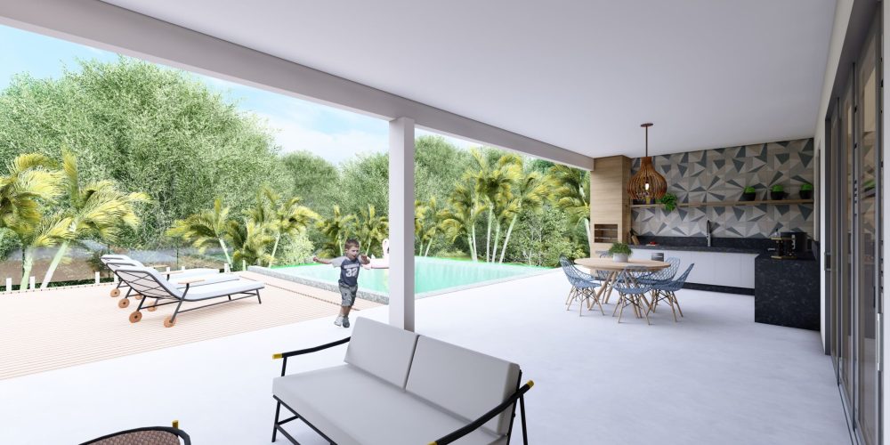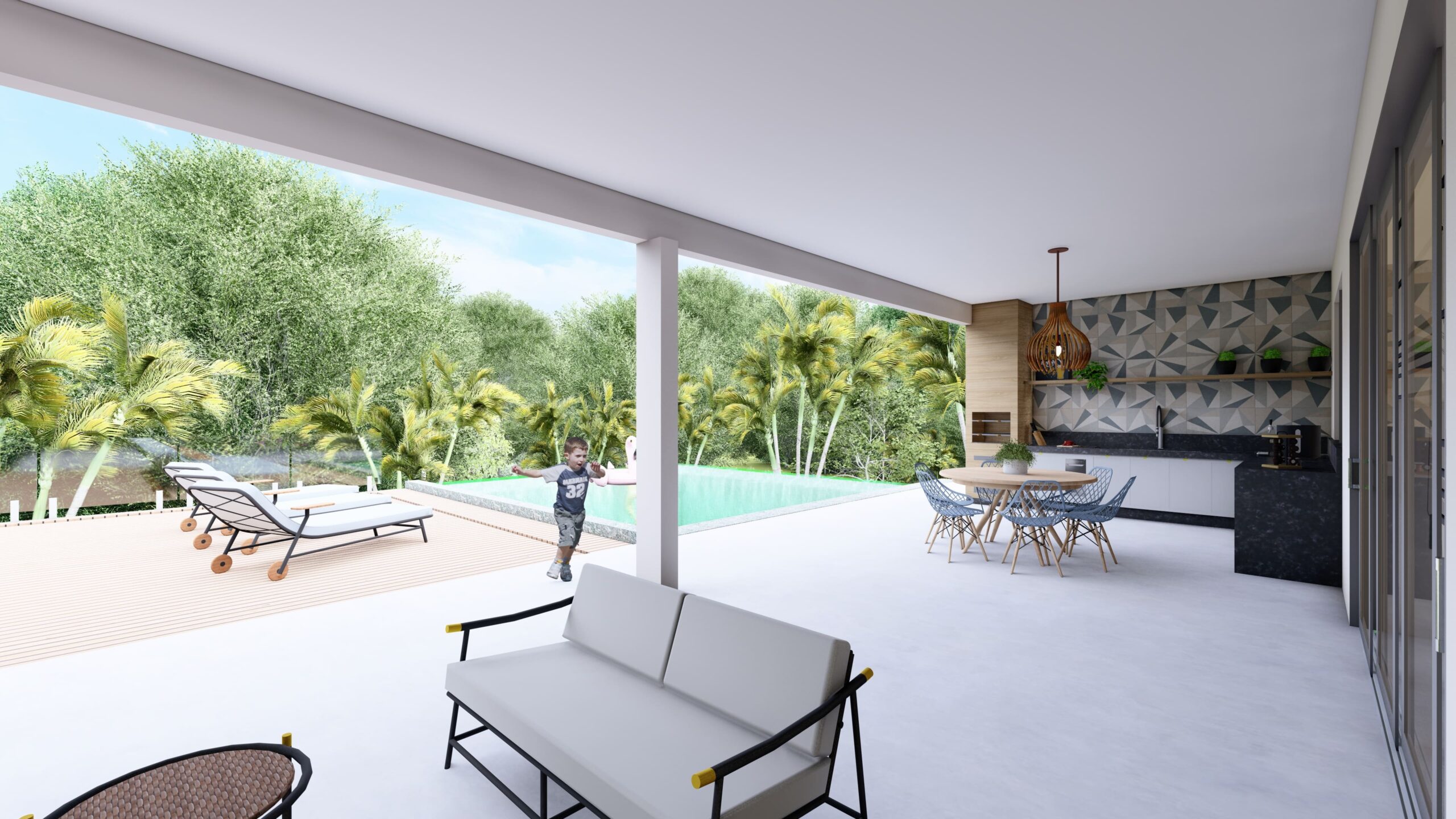 Na área externa, o destaque vai para a piscina de borda infinita que se funde ao horizonte, criando uma ilusão de continuidade com a paisagem e reforçando a sensação de um verdadeiro oásis tropical. O deck em madeira ao redor da piscina e a área gourmet são projetados para proporcionar momentos de relaxamento e lazer ao ar livre, complementando a experiência de vida em contato direto com a natureza.