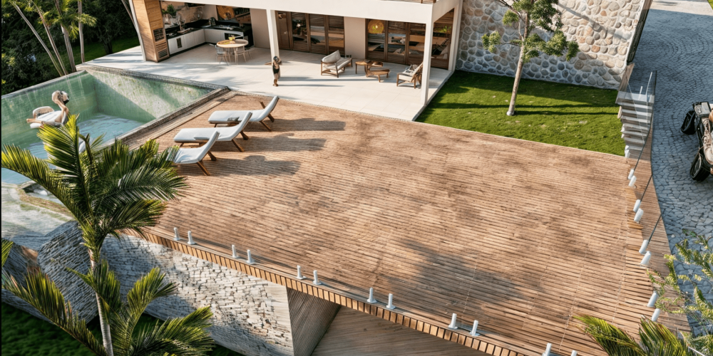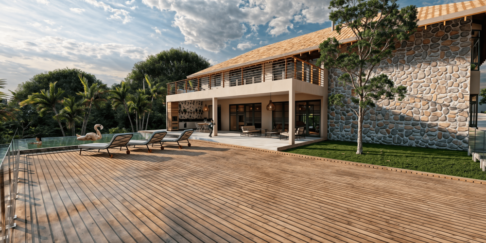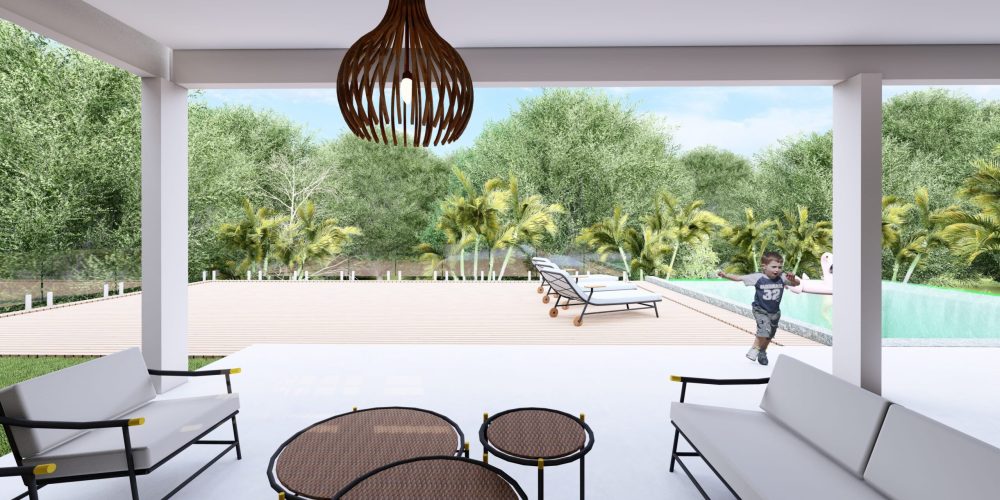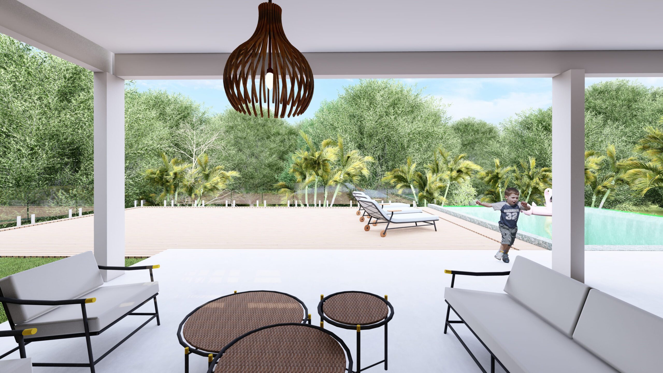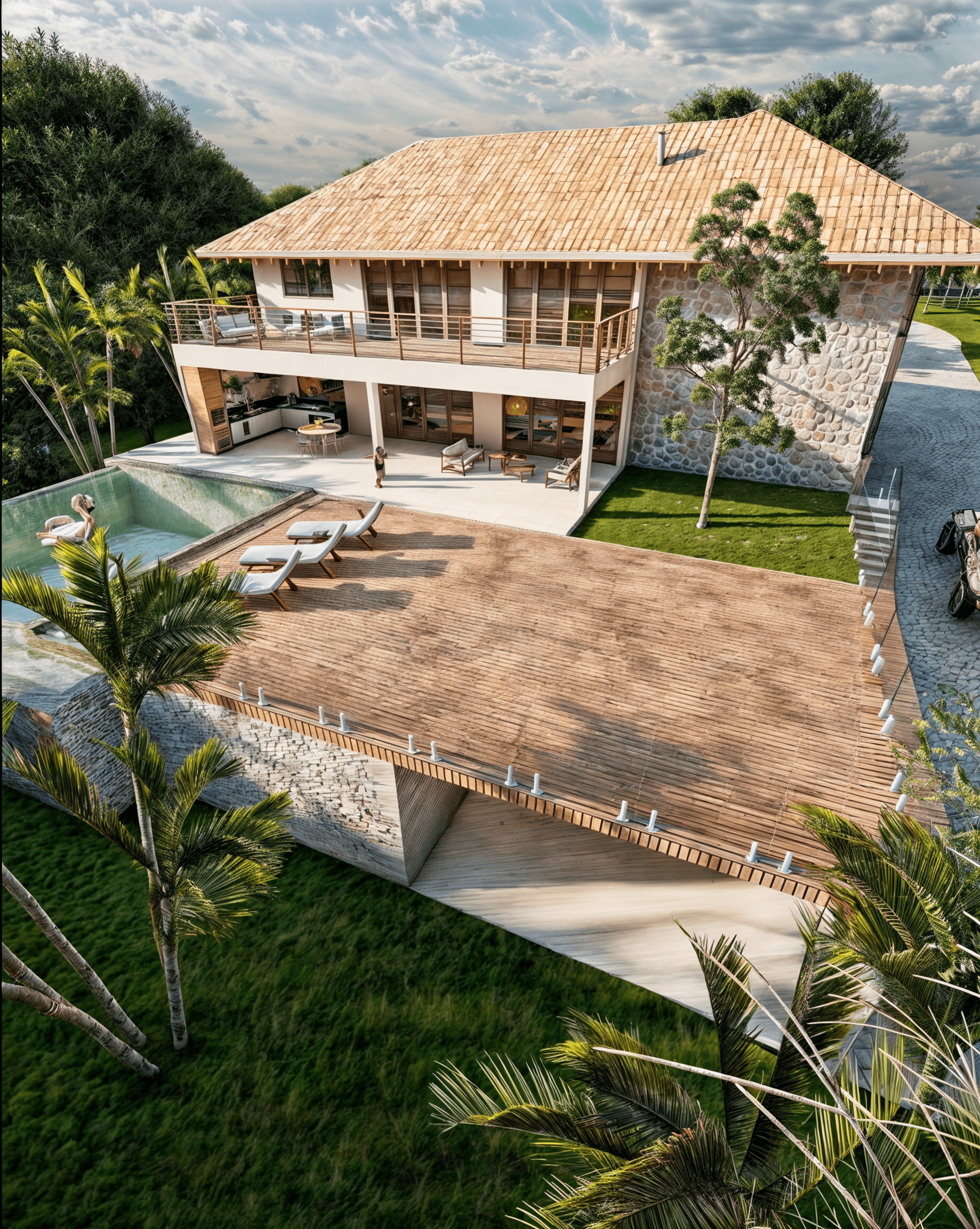 Na área externa, o destaque vai para a piscina de borda infinita que se funde ao horizonte, criando uma ilusão de continuidade com a paisagem e reforçando a sensação de um verdadeiro oásis tropical. O deck em madeira ao redor da piscina e a área gourmet são projetados para proporcionar momentos de relaxamento e lazer ao ar livre, complementando a experiência de vida em contato direto com a natureza.