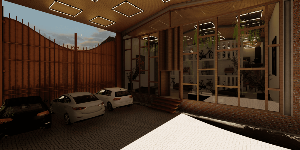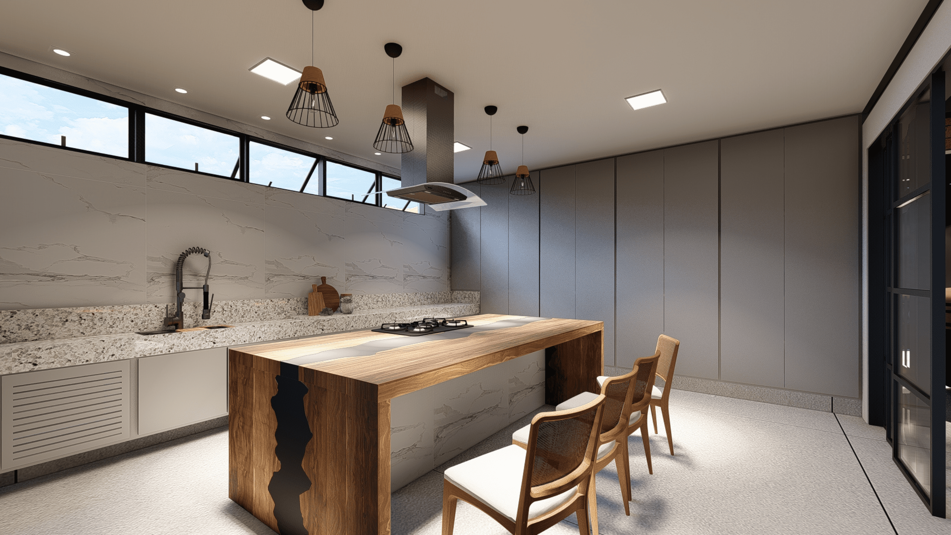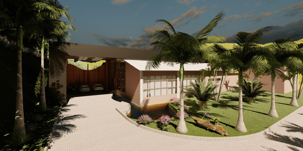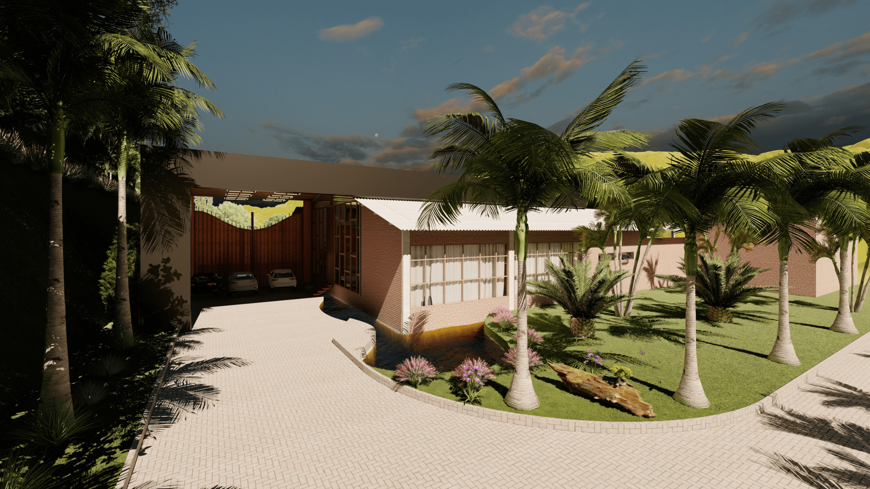 Sua entrada imponente, cercada por um paisagismo que combina palmeiras majestosas e plantas ornamentais, cria uma atmosfera acolhedora e sofisticada logo no primeiro contato. O uso de materiais naturais, como madeira e tijolos aparentes, juntamente com grandes aberturas em vidro, permite que a luz natural ilumine os ambientes internos, destacando as peças de mobiliário com elegância e simplicidade.
