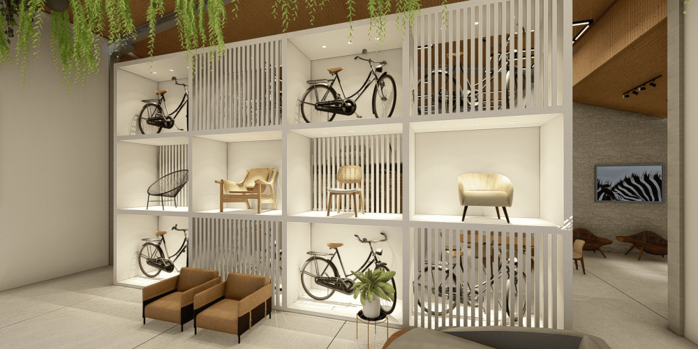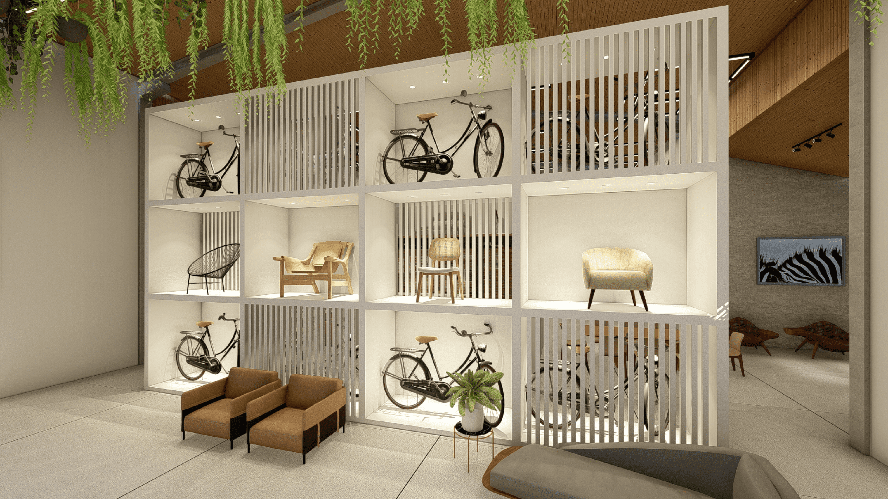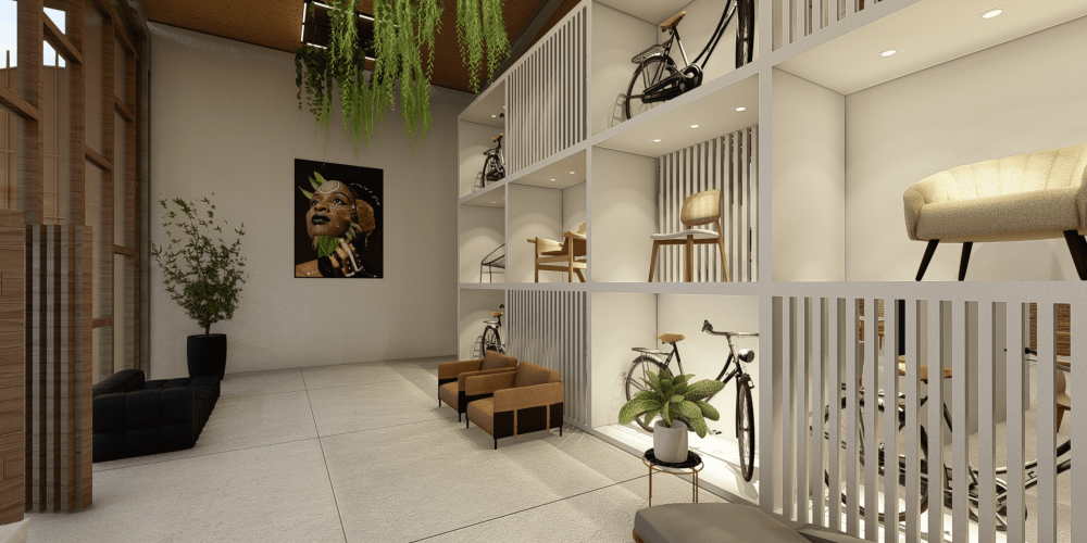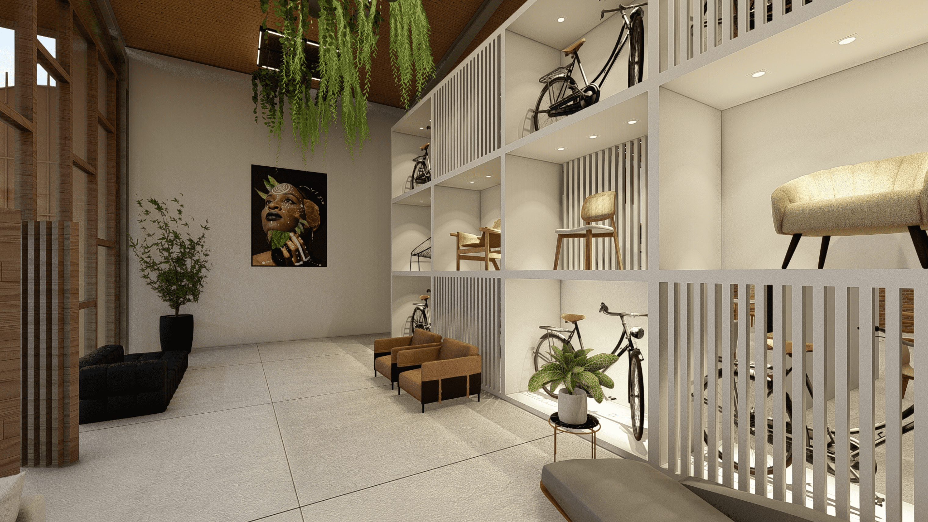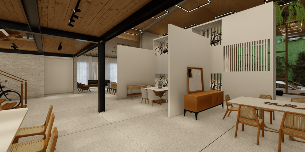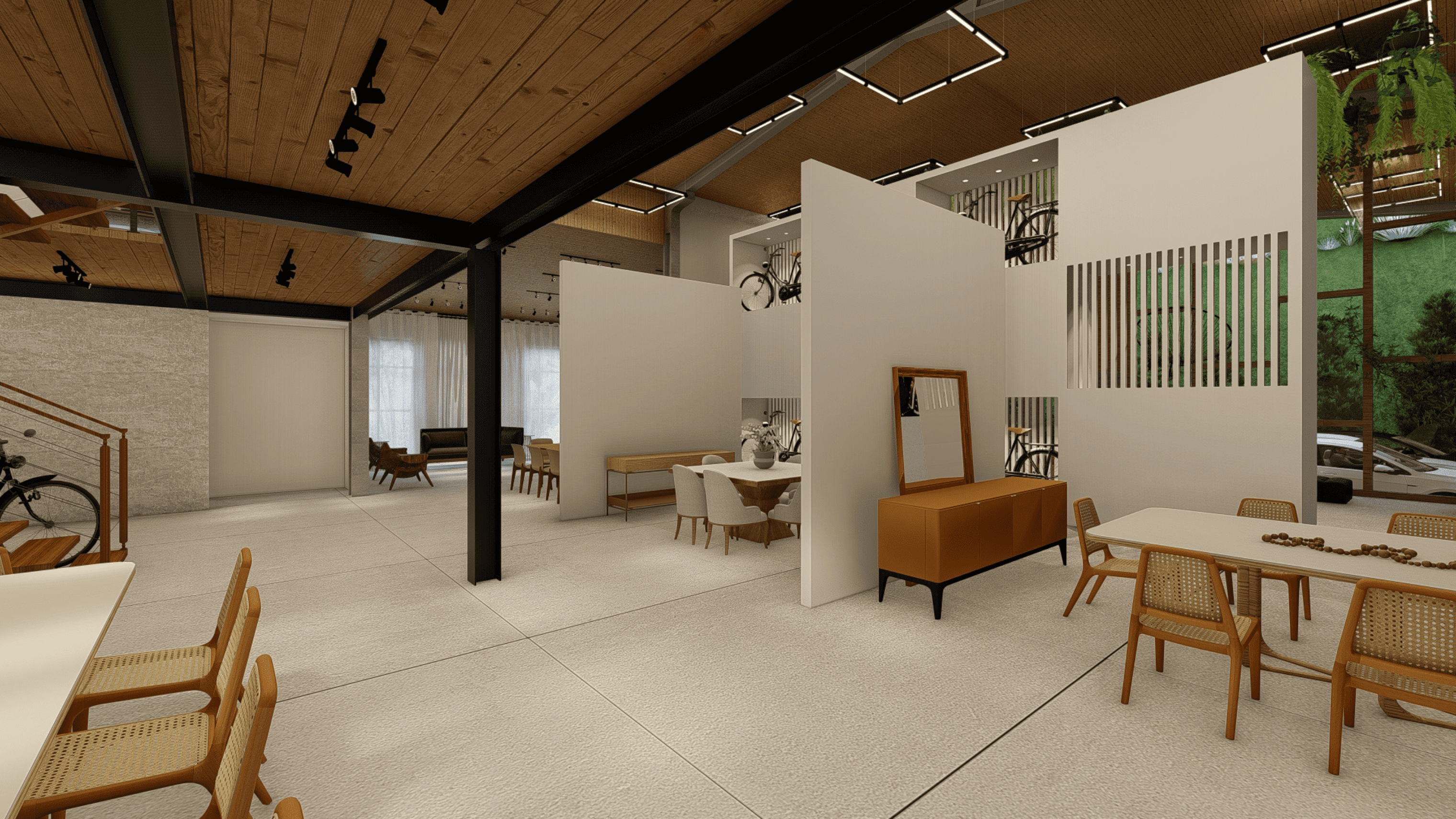 O interior do showroom revela um conceito de espaço aberto e fluido, onde cada área foi pensada para inspirar e valorizar o mobiliário exposto. A transição suave entre os ambientes internos e externos, marcada por grandes portas e janelas de vidro, integra o showroom à paisagem externa, proporcionando uma conexão direta com a natureza.