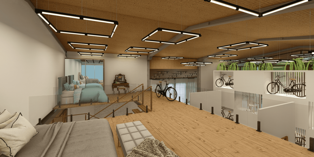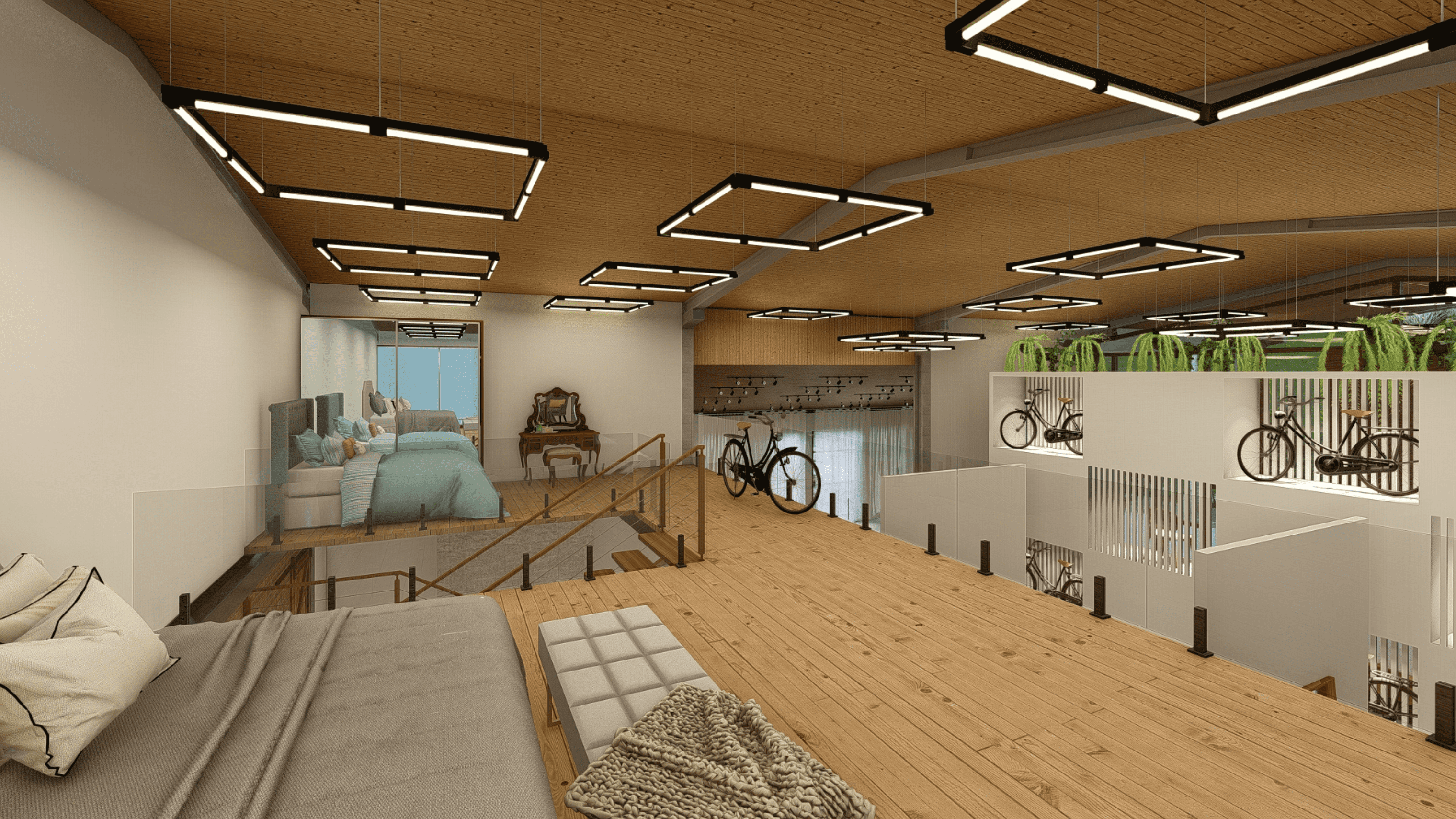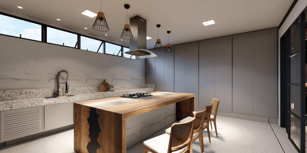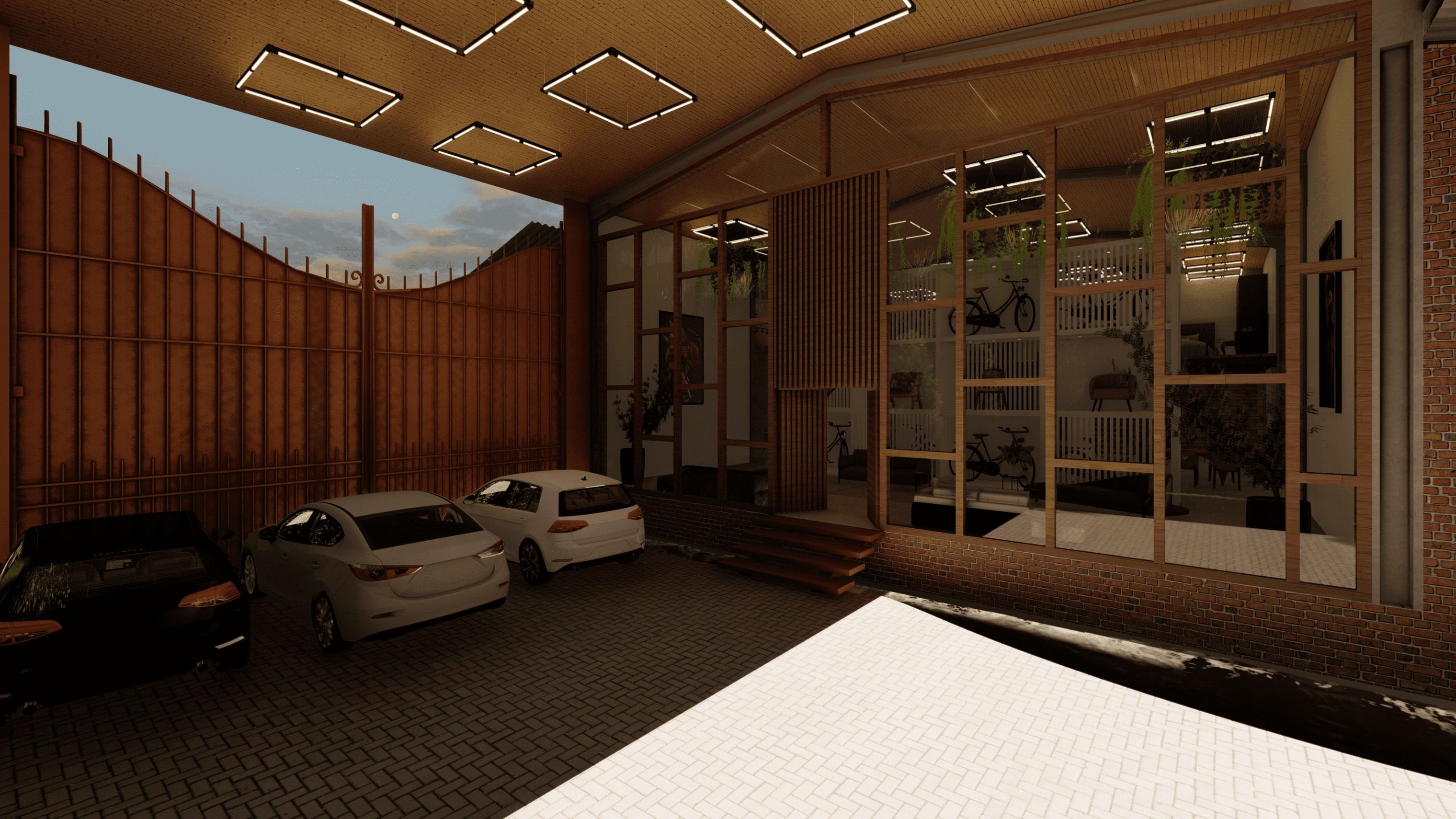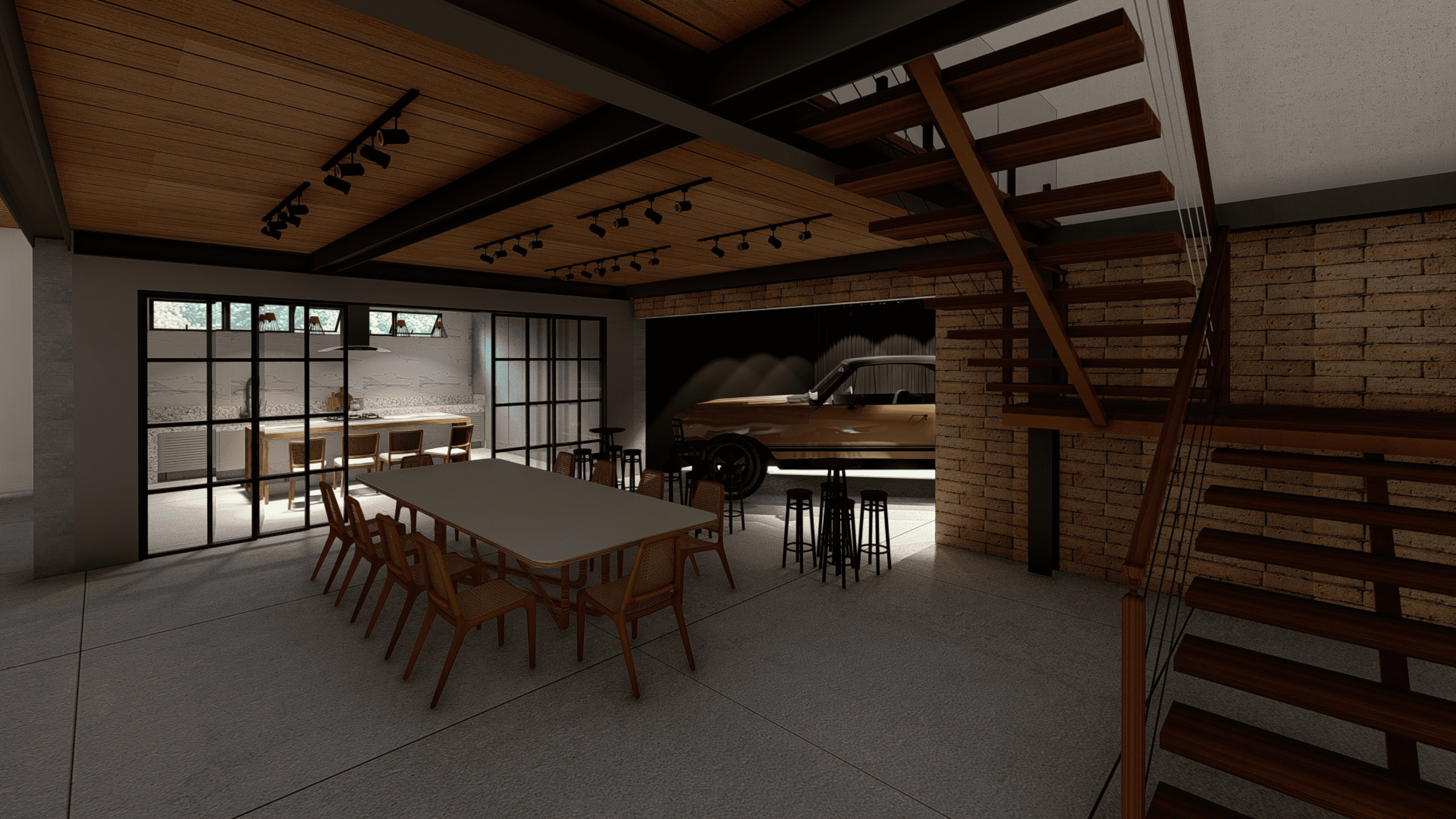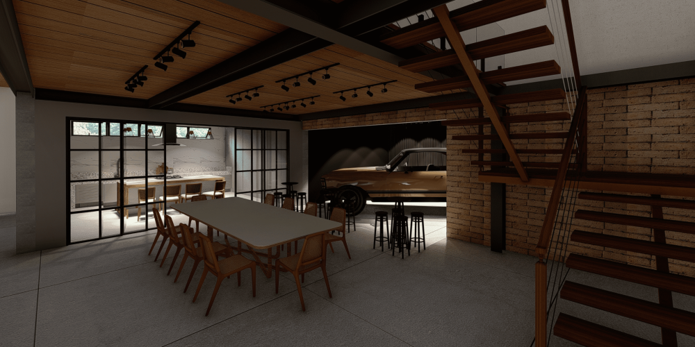 O interior do showroom revela um conceito de espaço aberto e fluido, onde cada área foi pensada para inspirar e valorizar o mobiliário exposto. A transição suave entre os ambientes internos e externos, marcada por grandes portas e janelas de vidro, integra o showroom à paisagem externa, proporcionando uma conexão direta com a natureza.