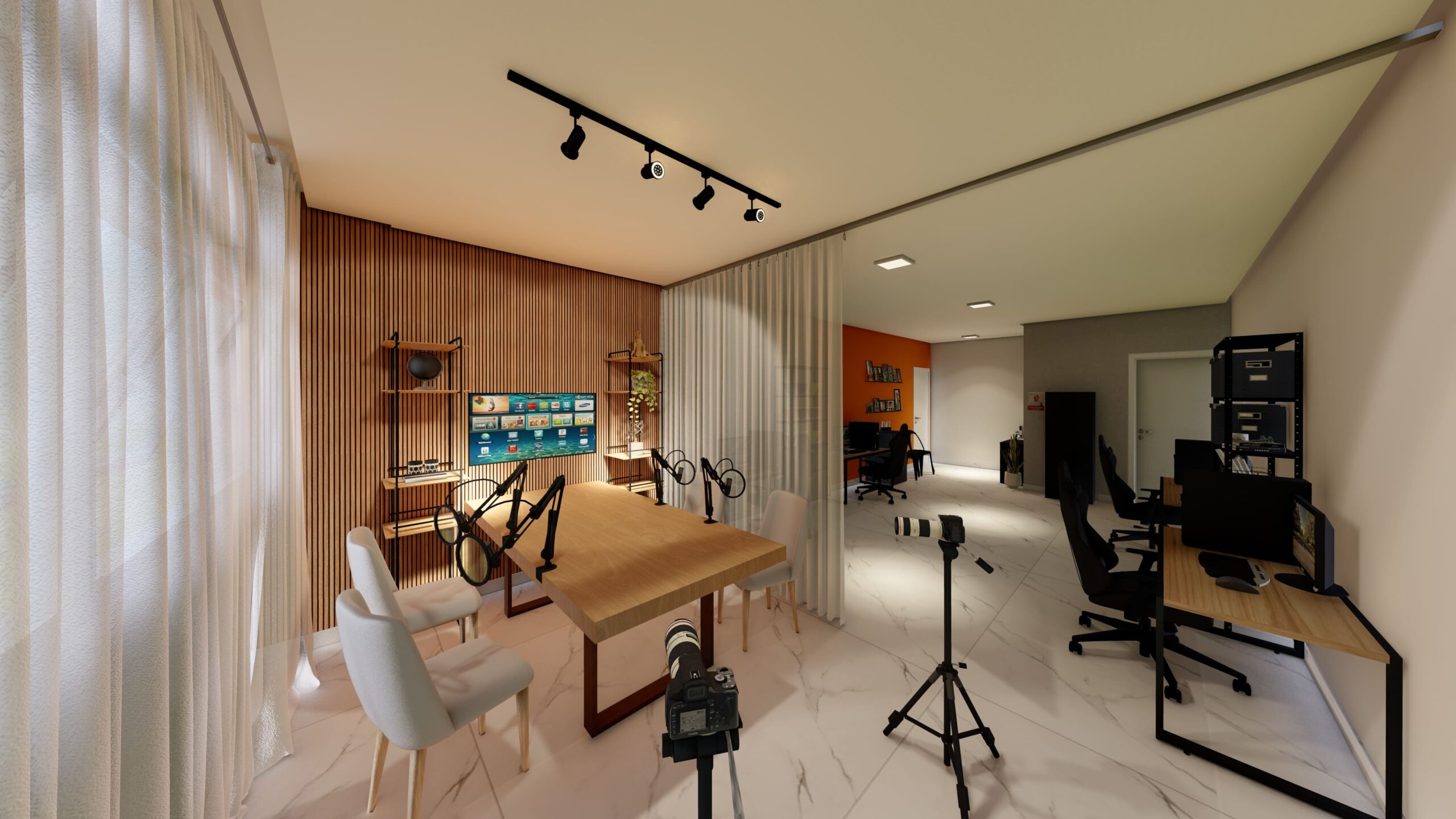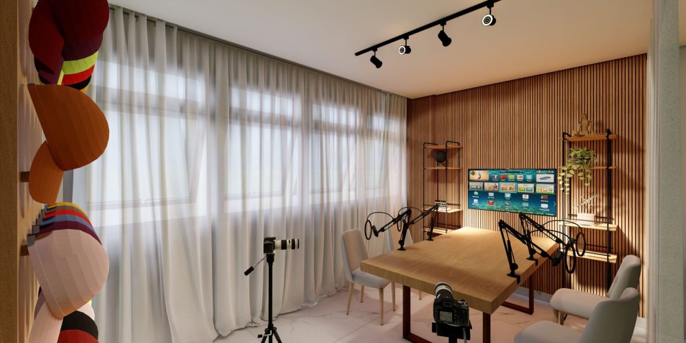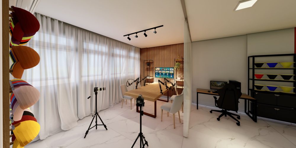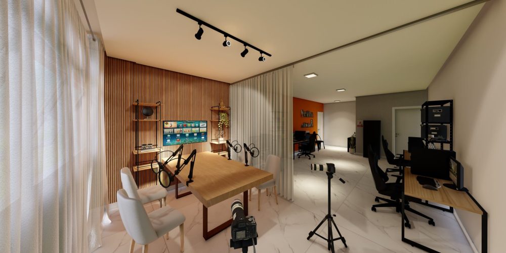 A estrutura do estúdio inclui uma área de gravação equipada com tecnologia de ponta, proporcionando acústica e iluminação otimizada para gravações de vídeos, podcasts e sessões fotográficas. As divisórias feita pela cortina permite a segmentação dos ambientes, garantindo flexibilidade no uso do espaço sem comprometer a iluminação natural.