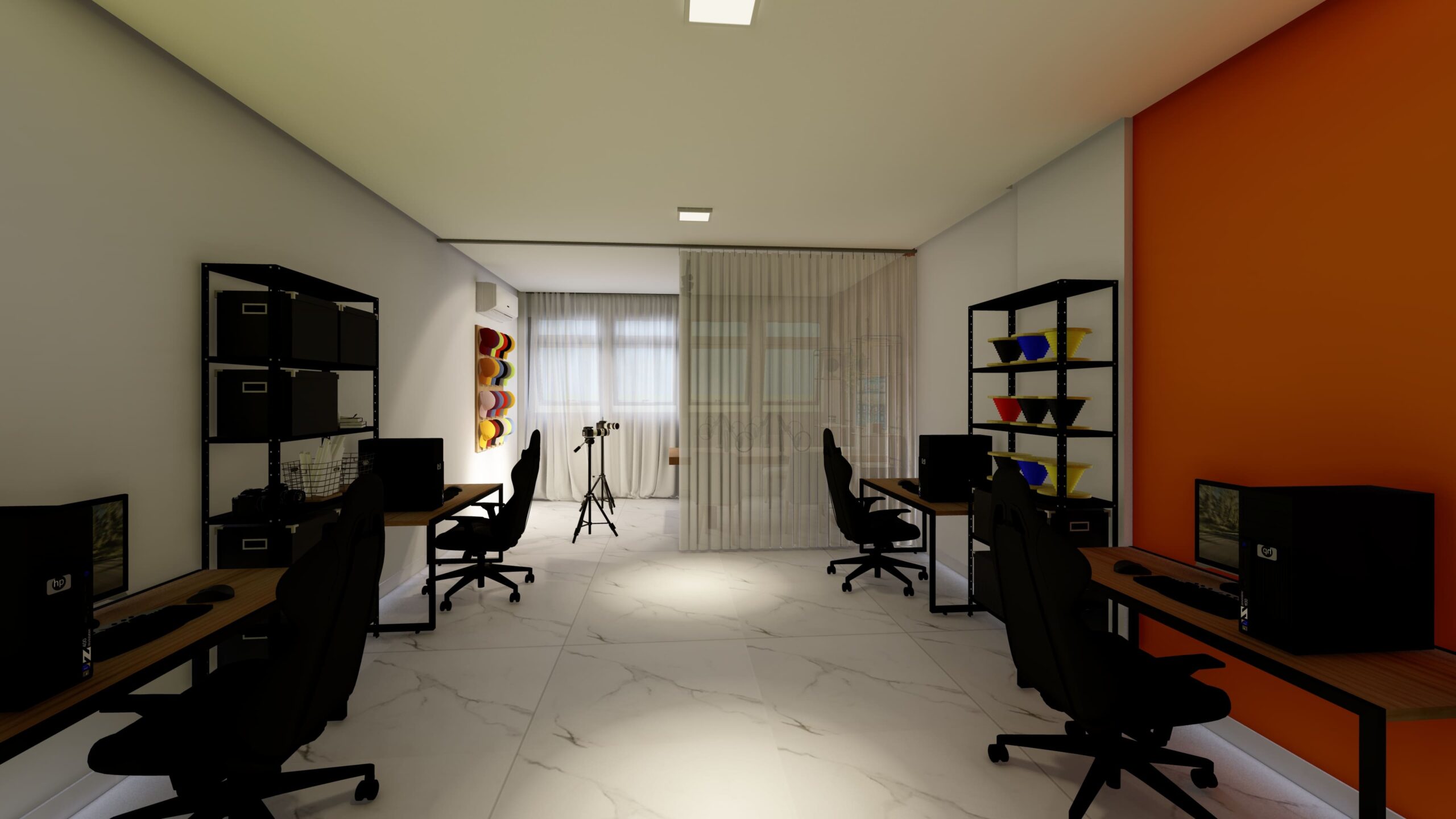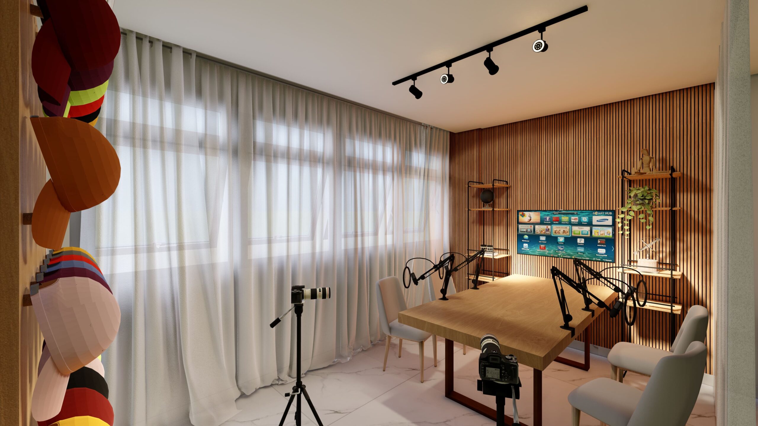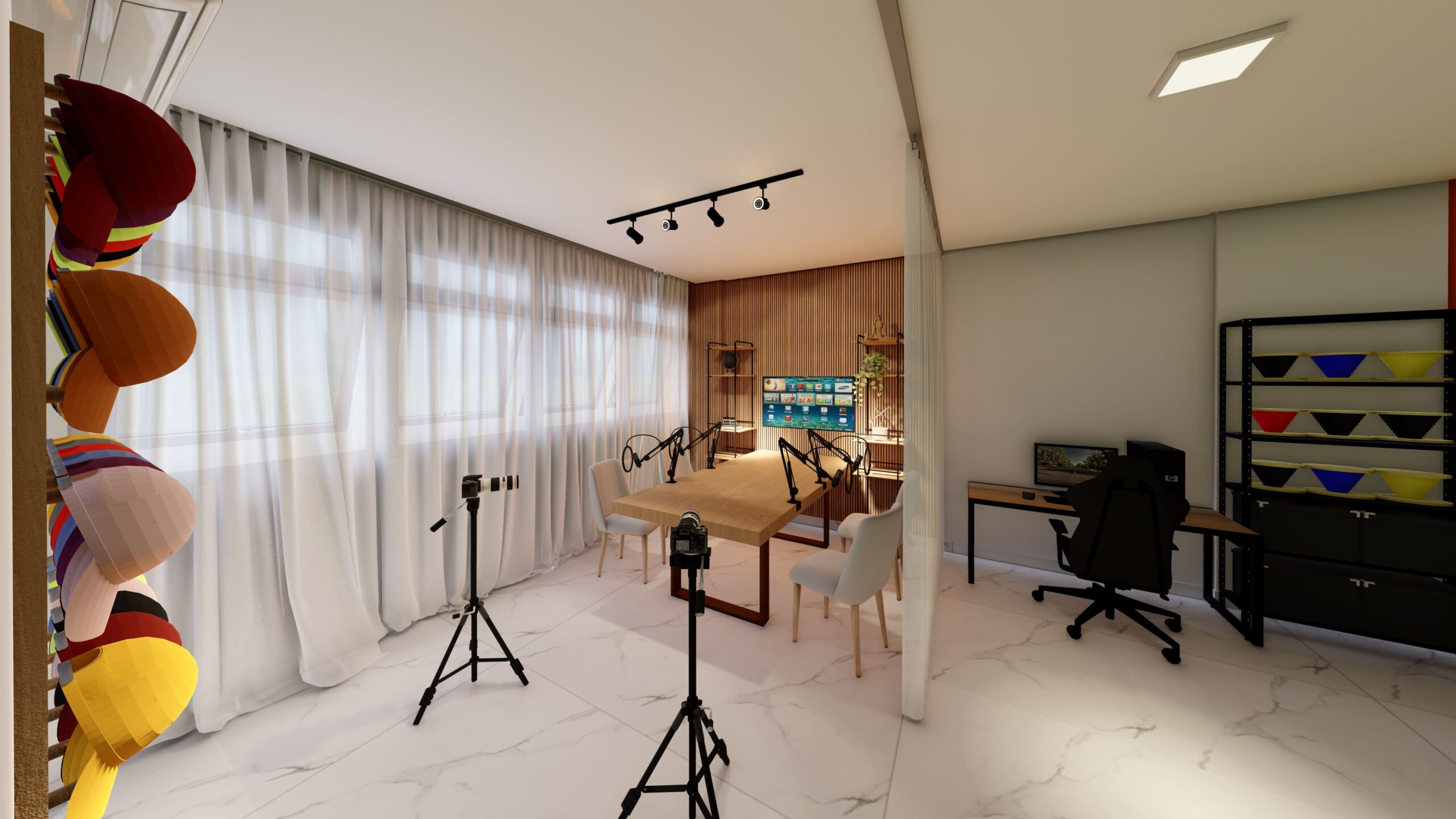 A estrutura do estúdio inclui uma área de gravação equipada com tecnologia de ponta, proporcionando acústica e iluminação otimizada para gravações de vídeos, podcasts e sessões fotográficas. As divisórias feita pela cortina permite a segmentação dos ambientes, garantindo flexibilidade no uso do espaço sem comprometer a iluminação natural.