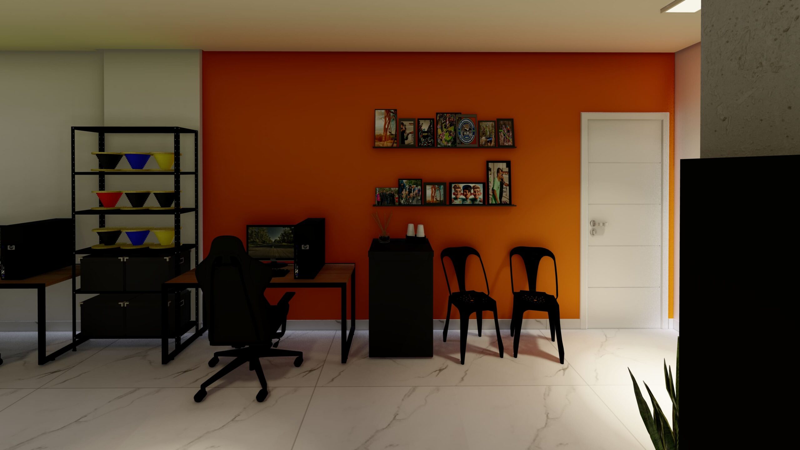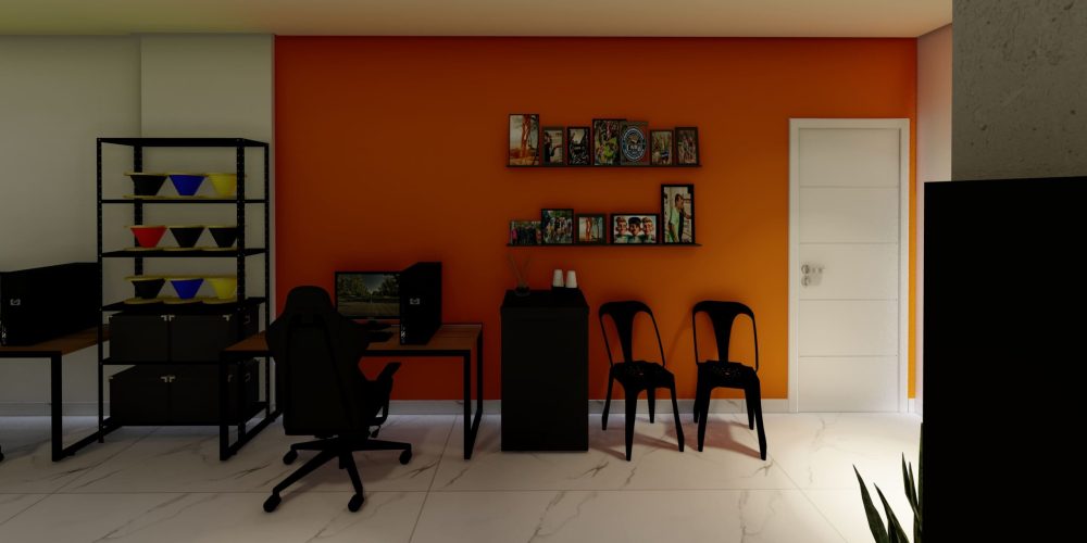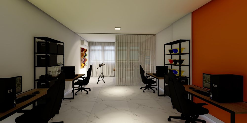 A mesa central do estúdio é ideal para reuniões de planejamento, gravações ou até mesmo para sessões de brainstorming, sendo cercada por equipamentos modernos e mobiliário ergonômico que garantem o máximo conforto para longas horas de trabalho. A área de pós-produção conta com estações de trabalho completas, equipadas com computadores de última geração, permitindo a edição de vídeos, imagens e som com fluidez e precisão.