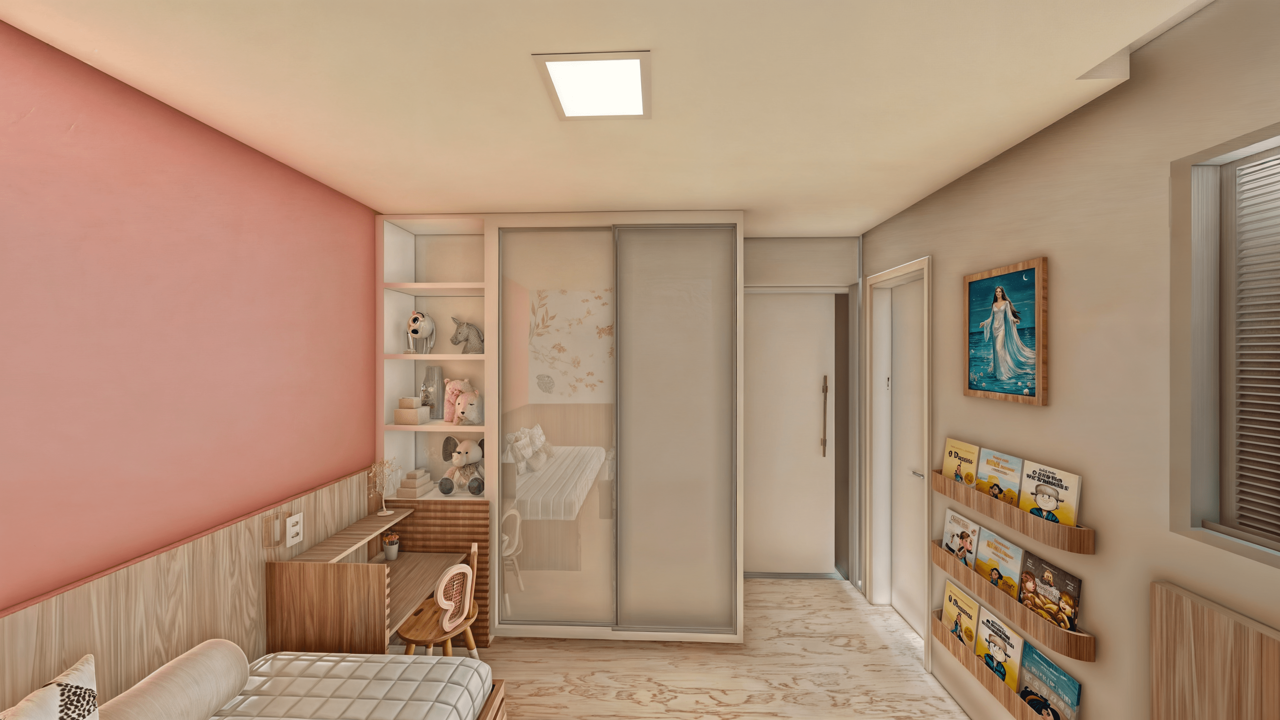 O Quarto Rosa foi concebido para ser um verdadeiro refúgio para as duas irmãs, um espaço onde a delicadeza e a funcionalidade se encontram, proporcionando um ambiente que promove conforto, segurança e alegria.