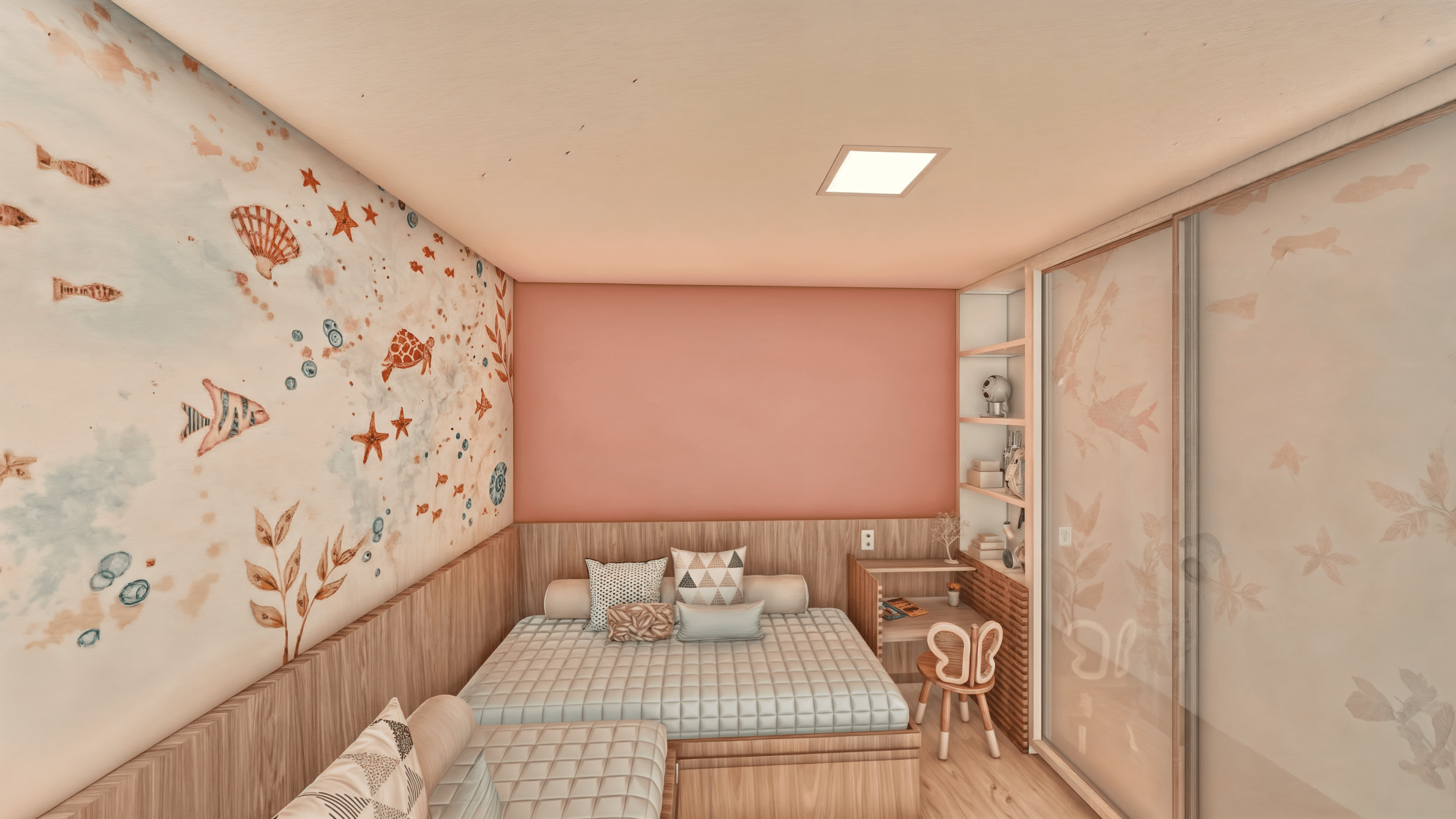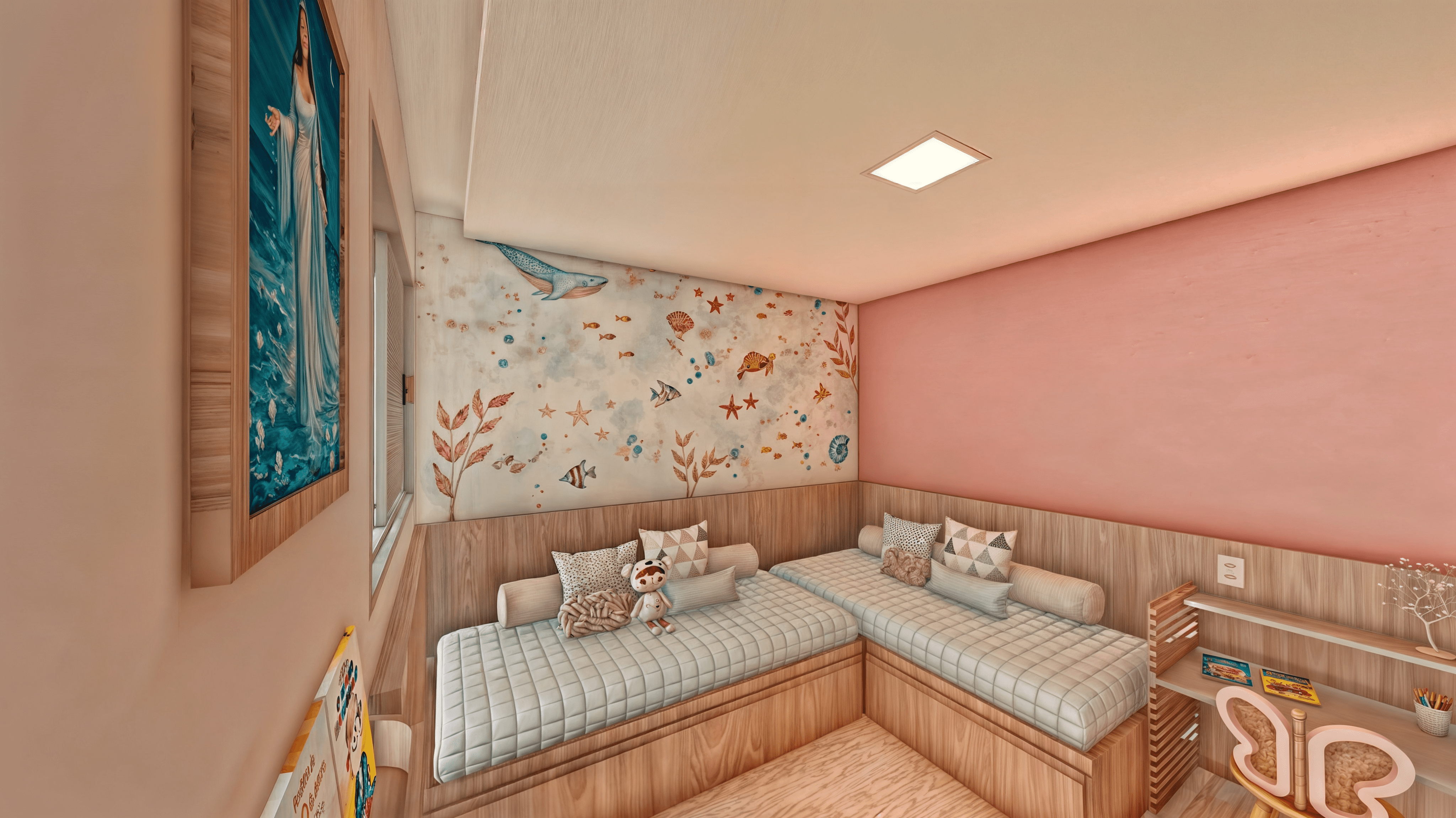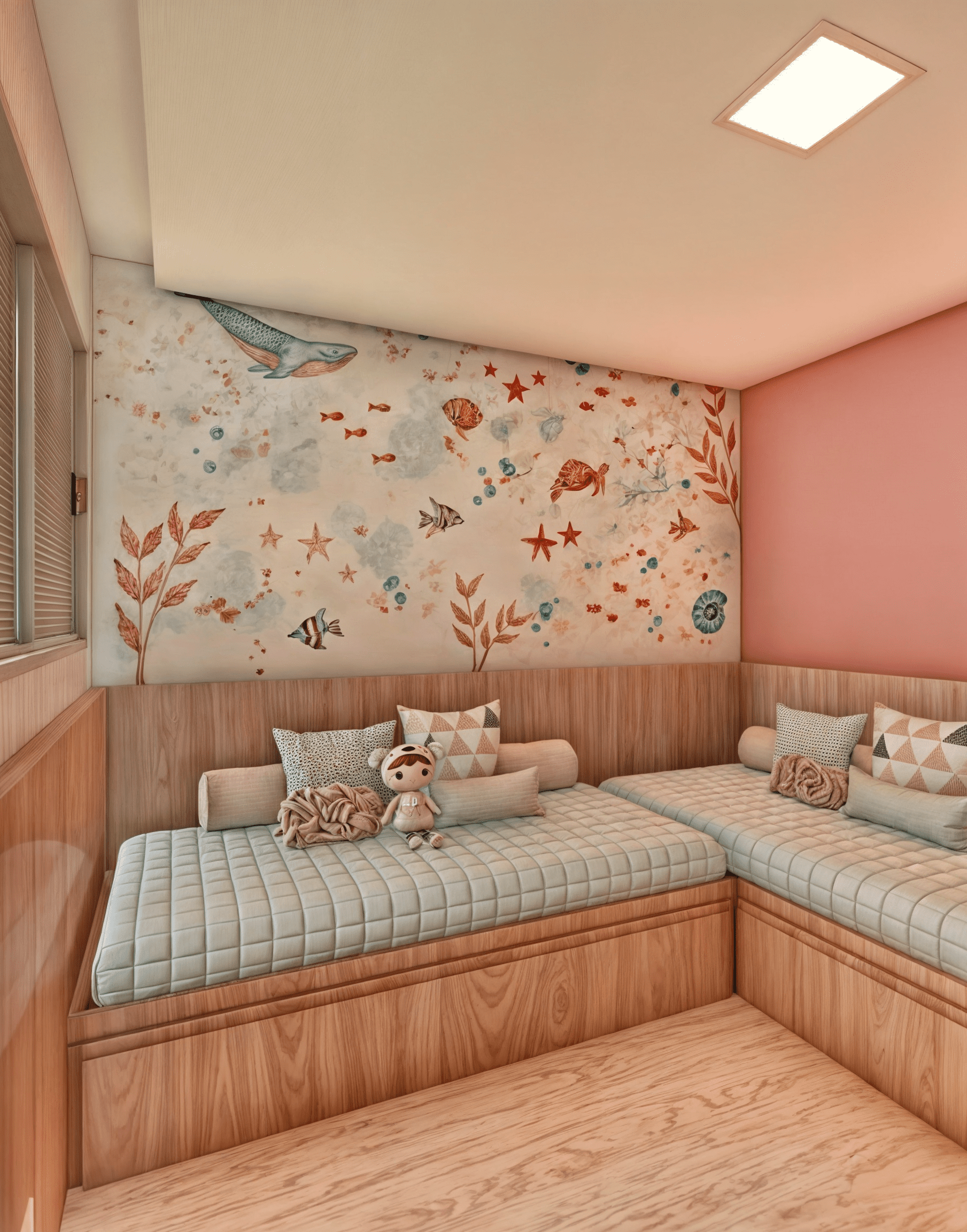 O projeto de interiores do Quarto Rosa foi pensado com carinho e atenção aos detalhes para criar um ambiente acolhedor e encantador para duas irmãs. Inspirado na temática do oceano, o quarto apresenta tons suaves e delicados, com papel de parede que retrata cenas marinhas, como peixes, estrelas-do-mar, tartarugas e algas, proporcionando uma atmosfera serena e lúdica.